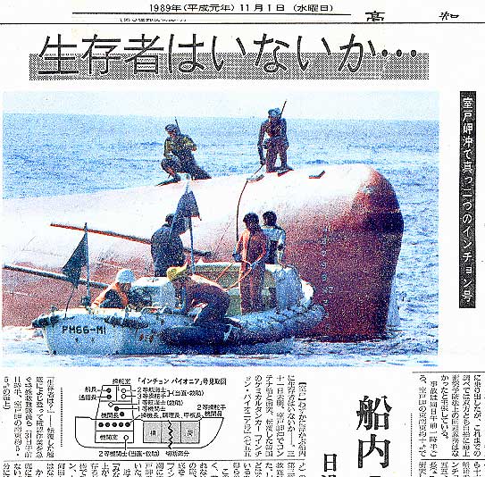 | As a result of the collision, the whole hull of the gINCHON PIONEERh was turned over to port and was split into two at about middle of the hull. Aft part of the vessel was immediately sank into the sea, while fore part drifted in an upside-down state, and 9 crew members were missing. Photo 1 &2 show fore part of m.v. gINCHON PIONEERh drifting showing her bottom above the water. |
