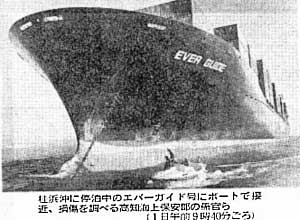 | Photo 3 shows the motor container gEVER GUIDEh after the collision with gINCHON PIONEERh. She suffered a hold (3,500mm~240mm max.) on her starboard bow at under-water level although the m.v. gINCHON PIONEERh was destroyed by the collision. | |
